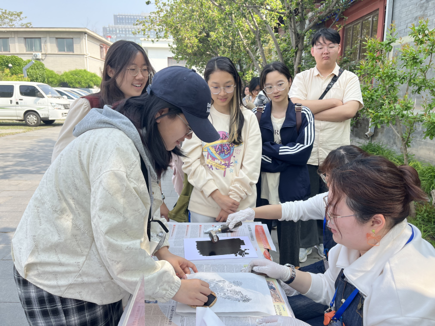 活动伊始,同学们在专业老师的指导和志愿者的帮助下,体验丁香木刻版画拓印。鲁迅先生曾大力倡导新兴木刻运动,重视木刻艺术在唤醒民众、传播思想中的作用。通过亲手拓印,同学们在实践中感受木刻艺术的独特魅力,也进一步理解了鲁迅先生以艺术启蒙大众、以文化唤醒民族的精神追求。